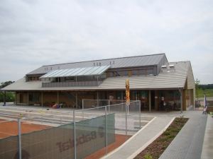 Staticky náročná stavba, jejíž systém je tvořen nosnými pilíři v kombinaci železobetonu a ocelových prvků. Stropní konstrukci objektu tvoří železobetonová zespoda pohledová deska s negativními navýšenými průvlaky, které tvoří součást stěnového systému 2.NP. Zastřešení objektu je realizováno efektní kombinací dřevěné vazby s betonovou střešní krytinou a titanzinkovou pásovou krytinou. Vstupní schodiště galerie s výhledem na kurty je zastřešeno ocelovou prosklenou konstrukcí. Fasáda objektu je tvořena provětrávaným zateplovacím systémem s obkladem ze severského smrku. V přízemí objektu jsou umístěny šatny hráčů, relax část se saunou a masérnou a objekt klubové místnosti s občerstvením. V 1.patře se nachází technická místnost hlasatele, galerie a 3 ubytovací jednotky.